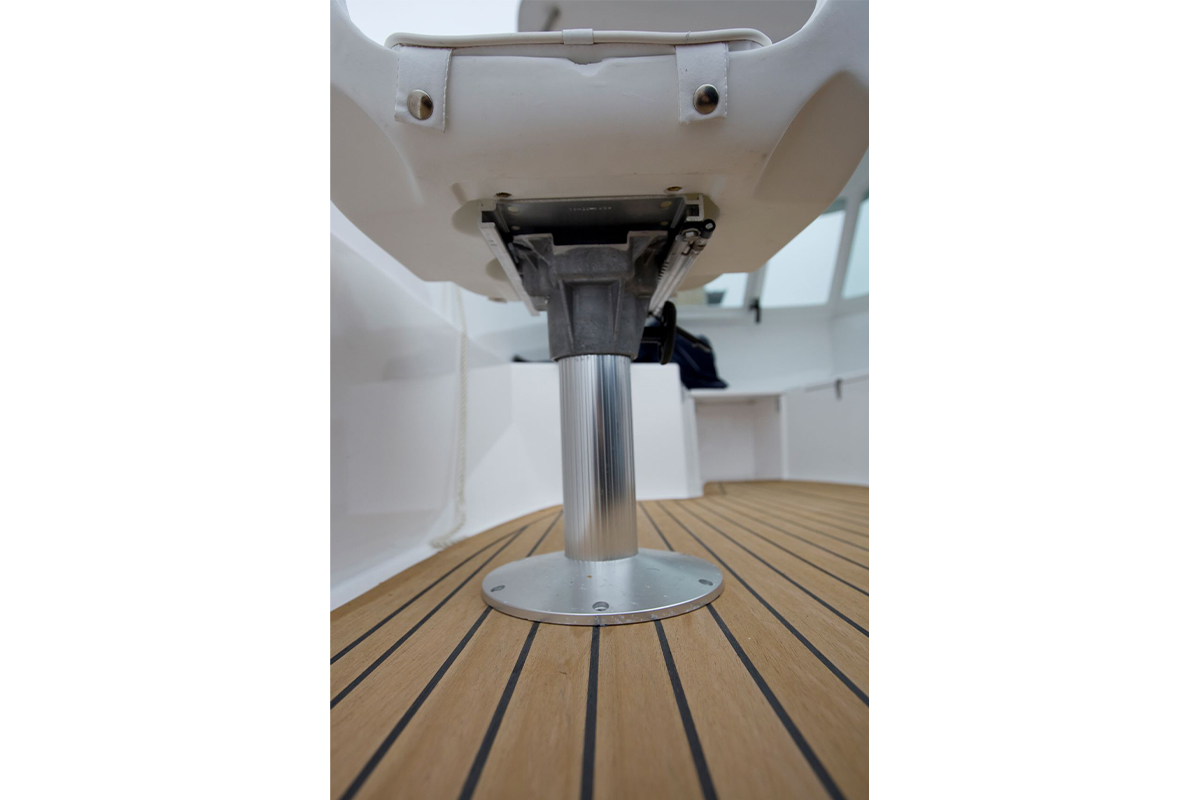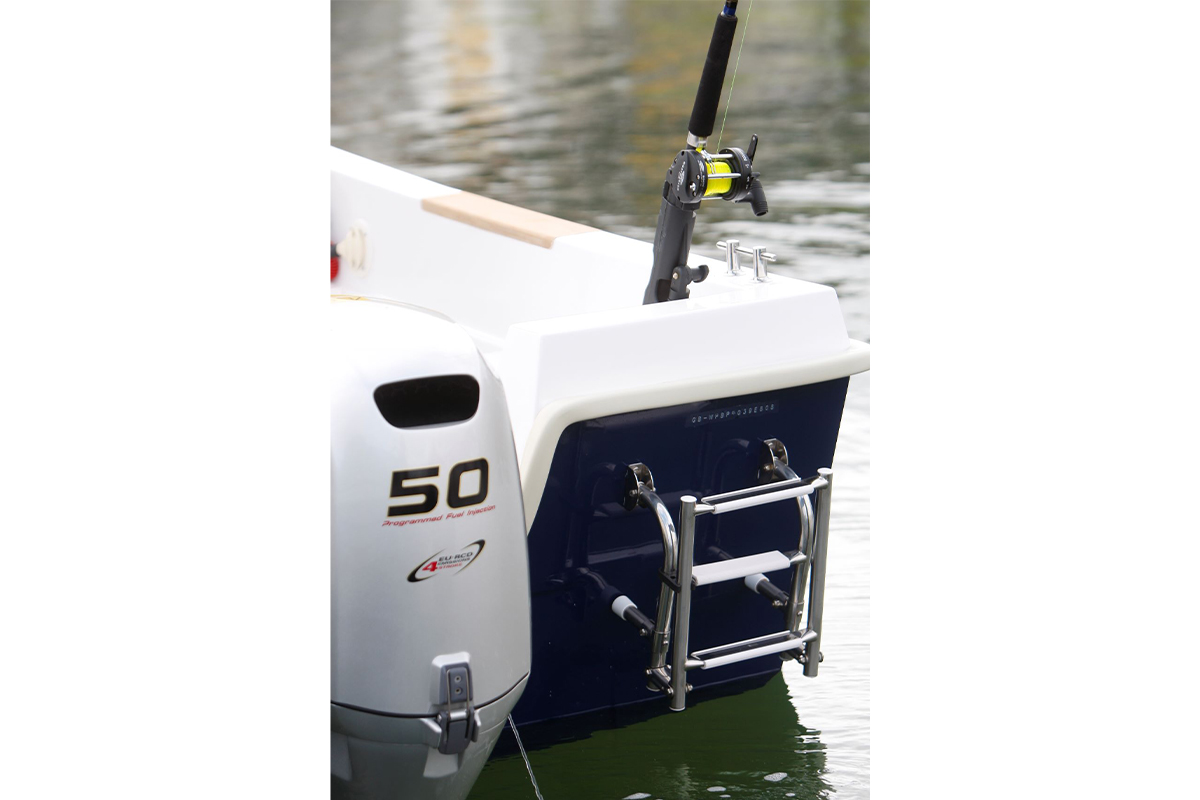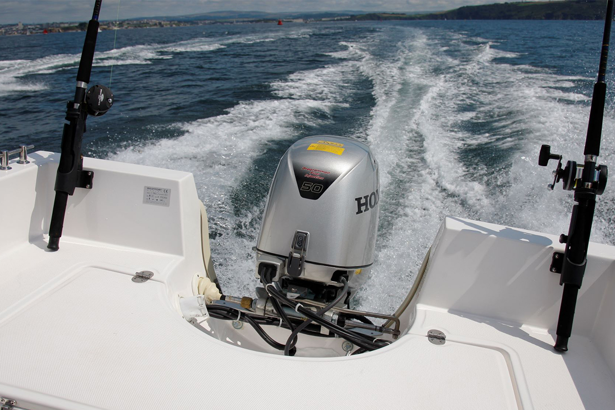 The hull is of a medium ‘V’ type with a deep forefoot creating fine sections forward that slice through choppy seas. Spray and chine rails improve performance and deflect spray down and away from the boat keeping her dry even if conditions deteriorate. The hull has a deadrise of 15 degs. aft and plenty of beam to support the larger and heavier 4-stroke outboards.