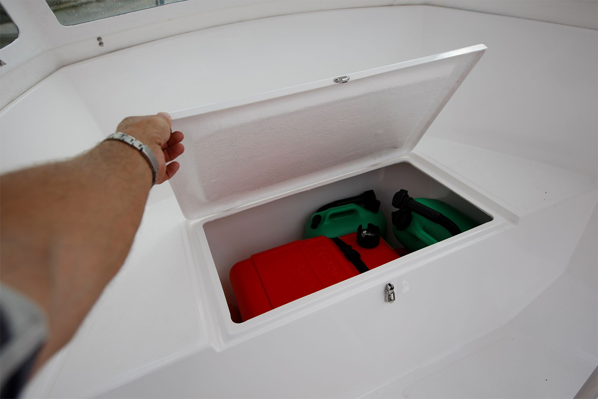The layout has been kept simple and practical, with large lockers forward and aft providing ample storage and seating. The steering console and helm seat have been positioned amidships to starboard keeping the majority of the deck open and versatile. An optional port side seat is also available. The removable cuddy is mounted forward with a rooftop hatch giving safe access to the foredeck when mooring and anchoring. This arrangement gives exceptional levels of visibility through the cuddy generally not found on many other similar boats.