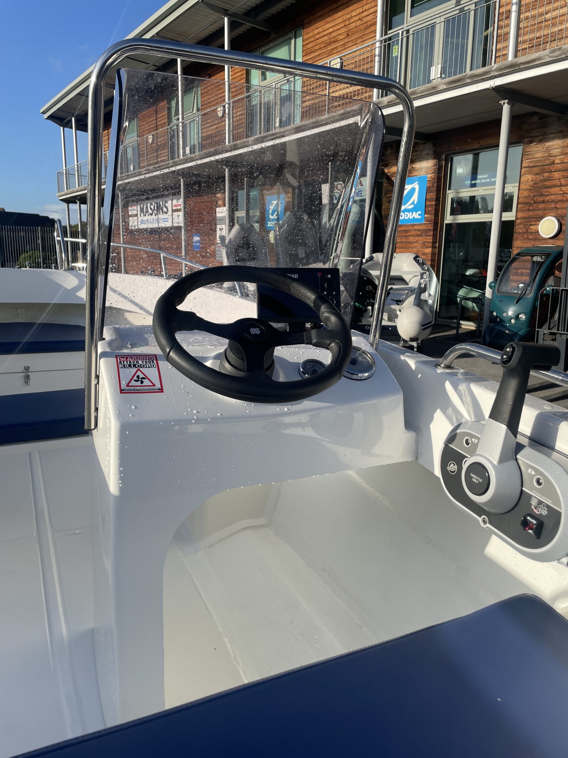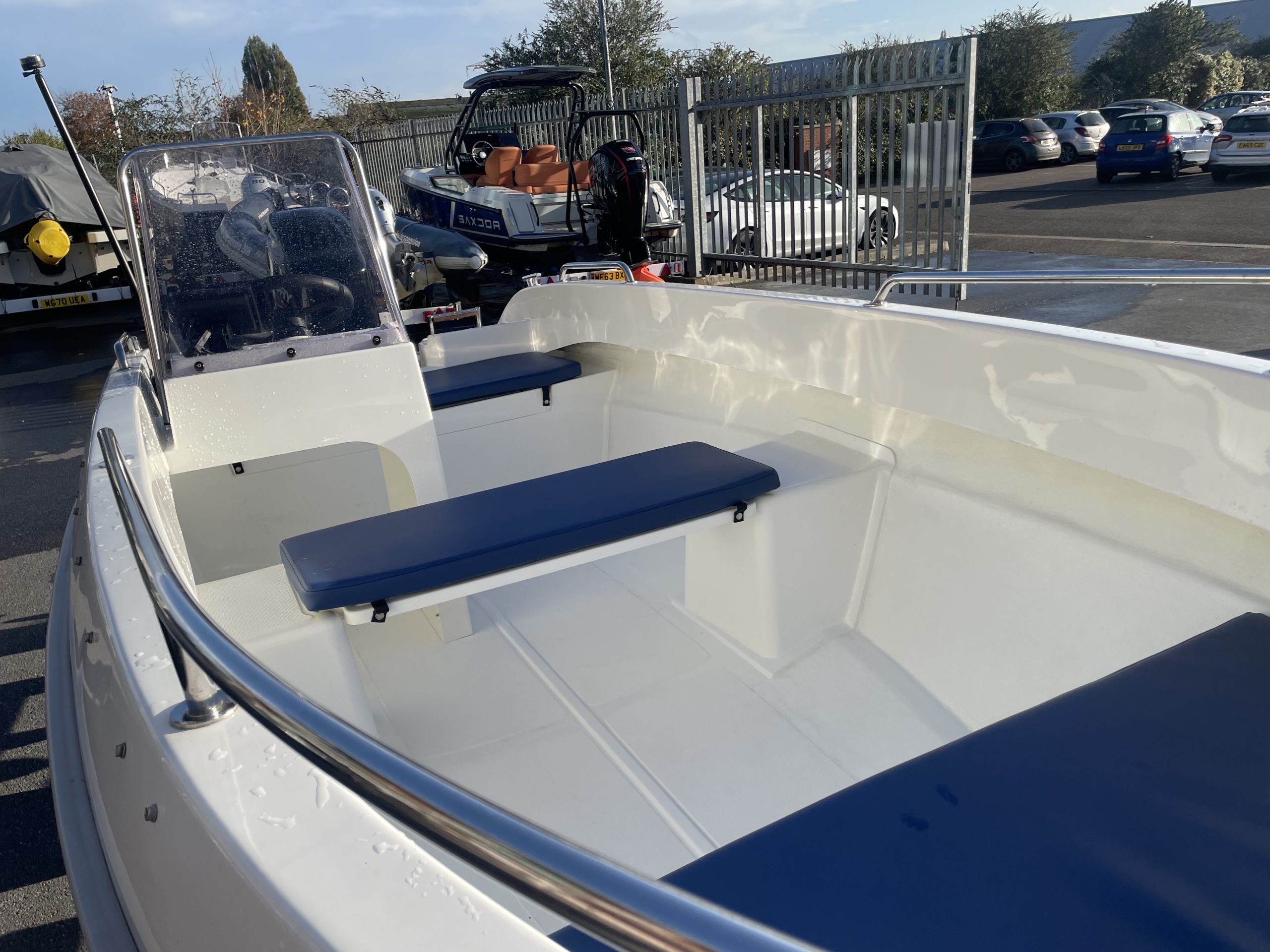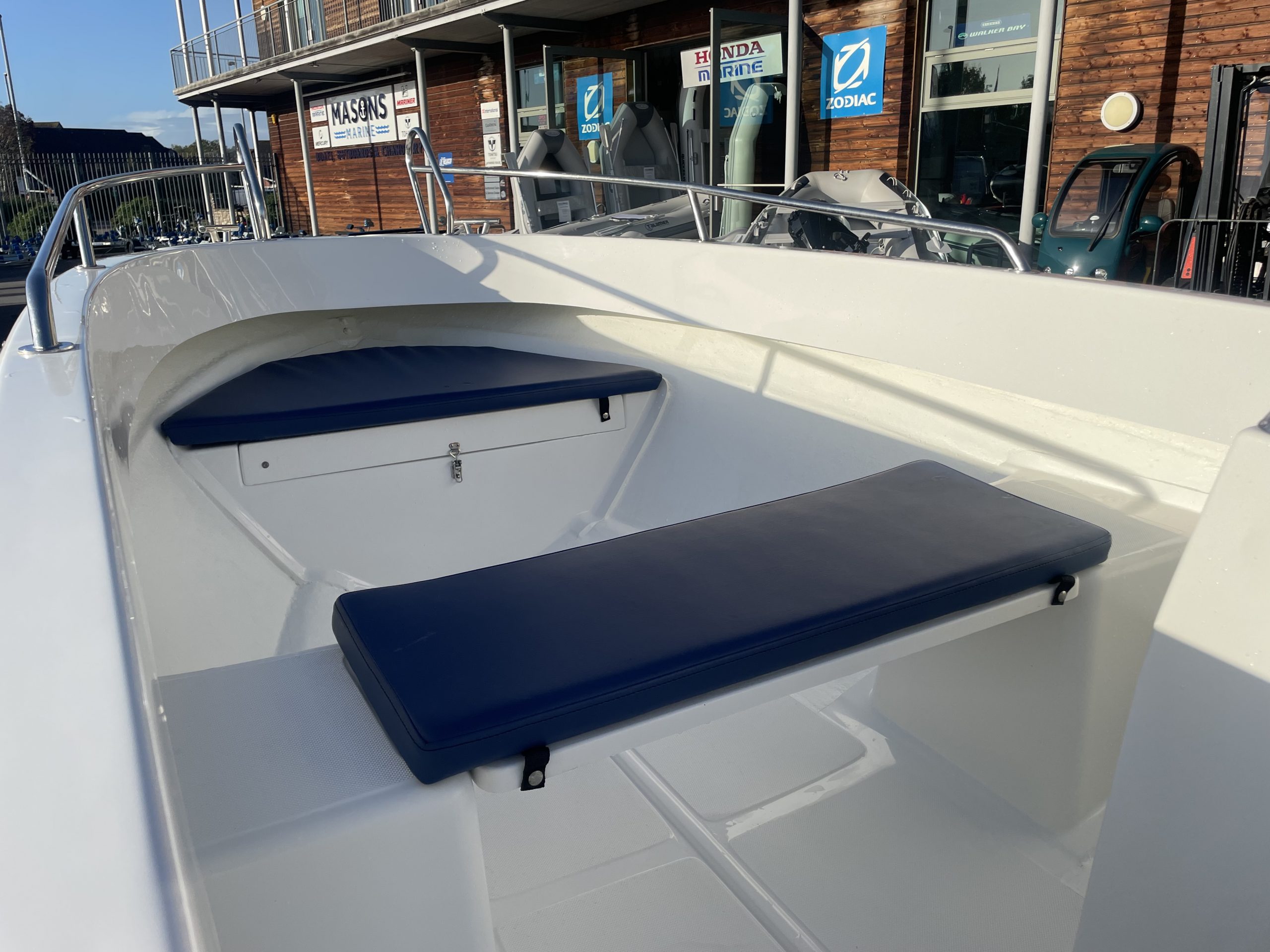 We have kept the layout simple with a bench seat aft with console to starboard. Amidships is a bench seat with removable mid section and further seating at the bows. Two large storage lockers are provided, one aft and one forward. The aft locker is used to store the battery and fuel tank, with plenty of space for tackle, fenders and kit. The bow locker easily swallows up the anchor, chain and warp with plenty of room left over.
